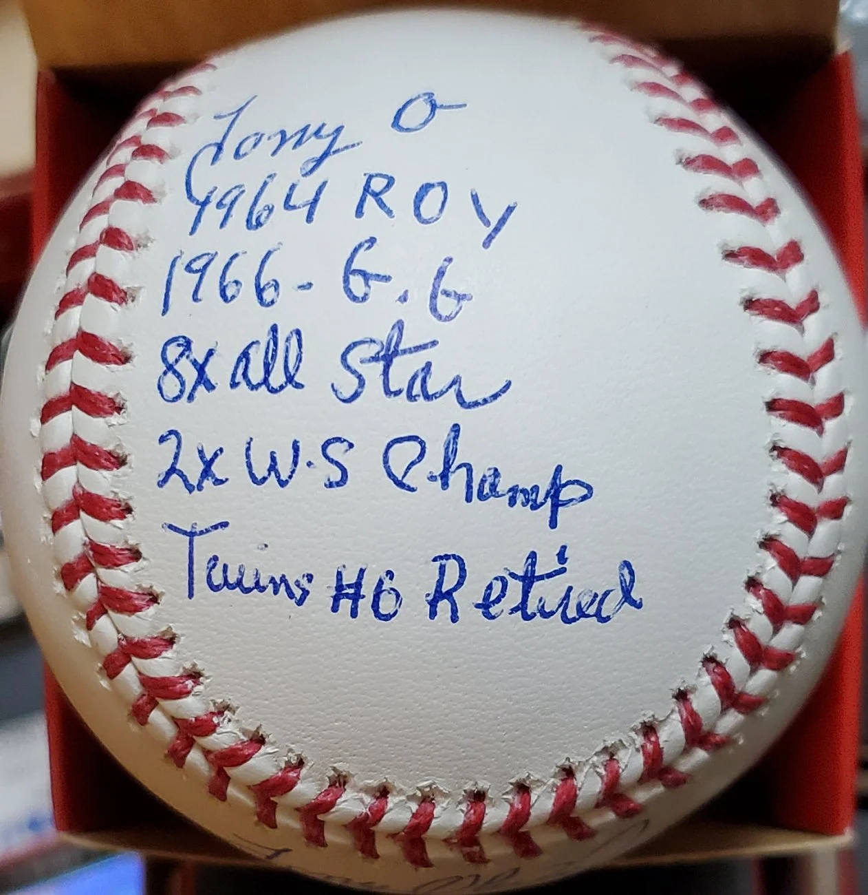 APPROVED INSCRIPTIONS: HOF 22, Twins HOF 2000, Twins #6 Retired, 8× All-Star, 2× WS Champ, 1964 AL ROY, 1966 G.G. and Tony-O or a personalization. Full Name Signatures are available but limited.