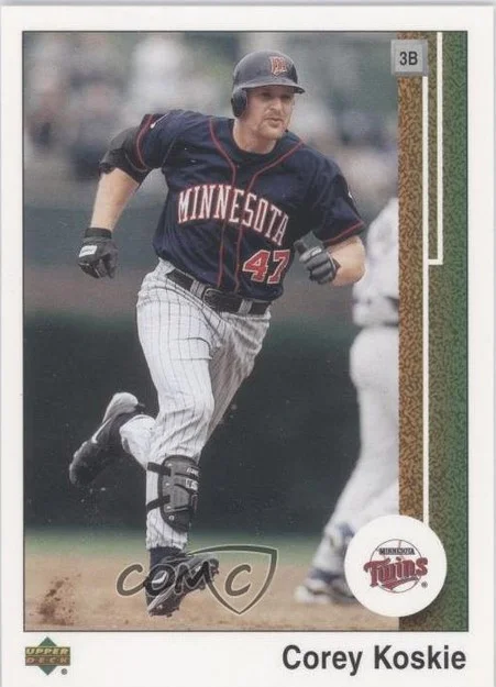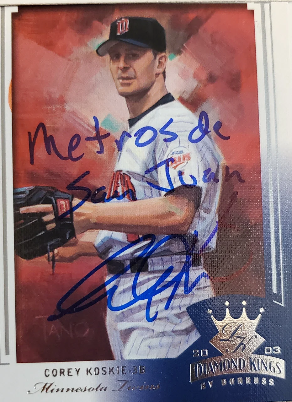 Koskie was drafted by the Minnesota Twins in the 1994 Major League Baseball draft, and subsequently made his MLB debut on September 9, 1998. He played 9 seasons before being injured and having a concussion which led to an ongoing post-concussion syndrome that ultimately led to his retirement from MLB. He has a lot of cards over the years and has not signed through the mail in over a decade.