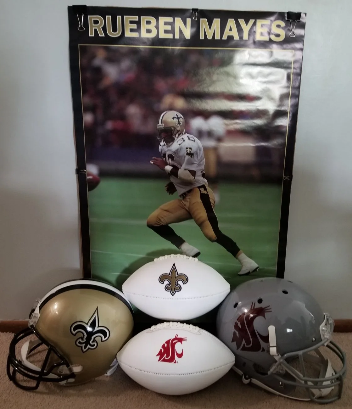 Former Saints star and Rookie of the Year Rueben Mayes will be doing an autograph signing on February 10 in Pullman, WA. 100% of the autograph proceeds are being donated to fund athletic training services to local high school athletes. The following items are available for purchase by mail if you can't make the signing. Check out pictures for item details. Email: 5StarSportsPullman@gmail.com for details or to place an order.